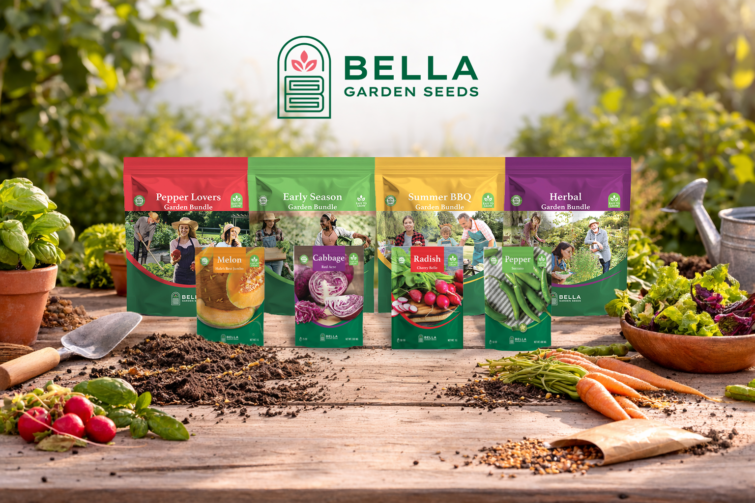 Bella Garden Seeds is a seed brand designed to make gardening accessible for everyone, from apartment gardeners to families and home cooks. The packaging system was created to support a large catalog of seed varieties while maintaining a clear, approachable visual identity across individual packets and curated bundles.